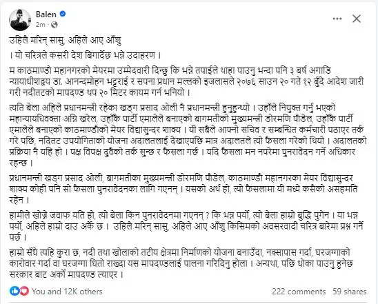 सामाजिक सञ्जाल फेसबुकमा स्टाटस राख्दै अदालतले नदीतटको मापदण्ड २० मिटर बढाउन आदेश दिँदा आफू काठमाडौं महानगरको मेयर पदमा उम्मेदवारी दिनेबारे थाहा पनि नभएको बताएका छन् । न्यायाधीशद्वय डा. आनन्दमोहन भट्टराई र सपना प्रधान मल्लको इजलासले २० साउन ०७६ मा नदीतटीय क्षेत्रको मापदण्ड २० मिटर थप्नेसहित १२ बुँदे आदेश दिँदा केपी शर्मा ओली नै प्रधानमन्त्री रहेको उल्लेख गरेका छन् ।