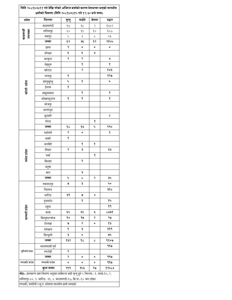 काठमाडौँ । बाढीपहिरामा परी देशभर २१९ जनाको मृत्यु, २७ बेपत्ता र १५६ जना घाइते भएका छन् । प्रहरीका अनुसार यो आज (मंगलबार) दिउसो १२ः३० सम्मको विवरण हो ।