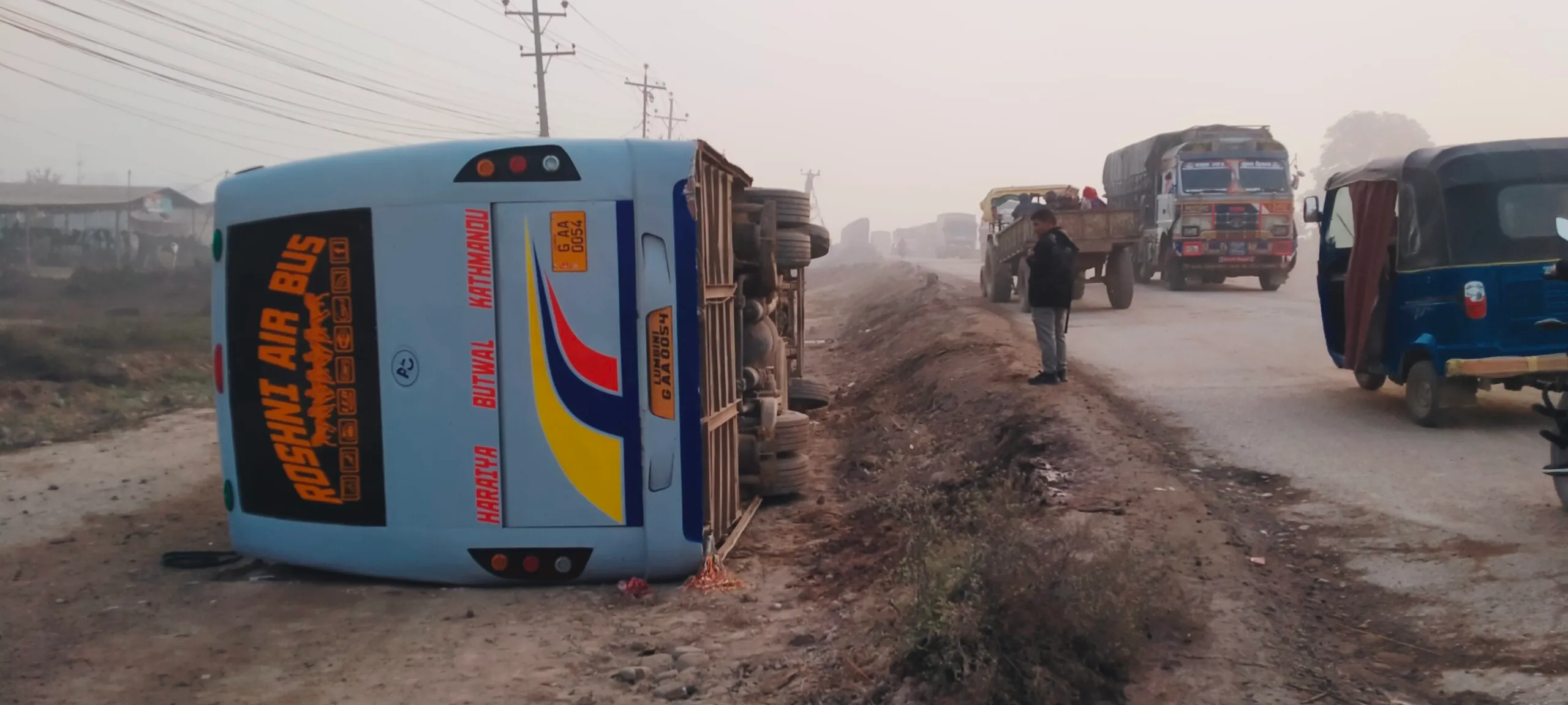 बुटवलबाट काठमाडौंका लागि हिंडेको “लुम्बिनी जिएए ००५४” नम्बरको रोशनी डिलक्स बस गएराती सवा २ बजे सडक छेउमा पल्टिएको हो। सडक निर्माण कार्य भैरहेको र सडक छेउमा खाडल रहेकाले बस पल्टिएको स्थानियले बताएका छन् ।