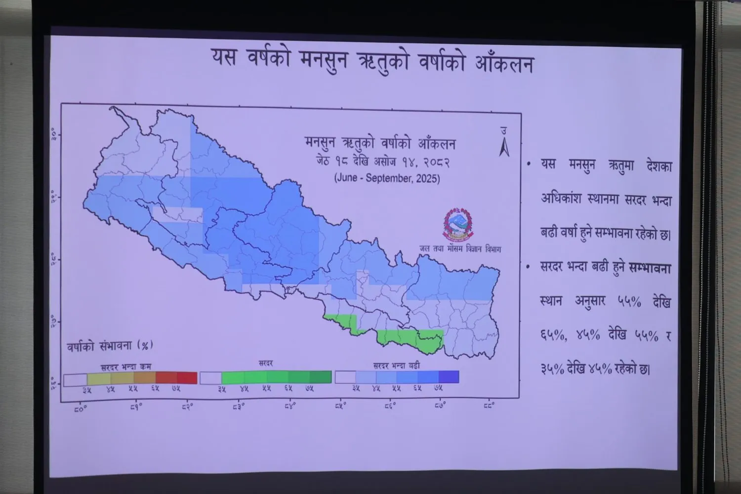 विभागका महानिर्देशक कमलराम जोशीले यस वर्ष यही जेठ १८ गतेदेखि आगामी असोज १४ मनसुन अवधि हुने र गण्डकी प्रदेश, लुुम्बिनी प्रदेशको उत्तरी भाग र कर्णाली प्रदेशको पूर्वी भागमा सरदरभन्दा बढी वर्षा हुने जानकारी गराएका थिए ।