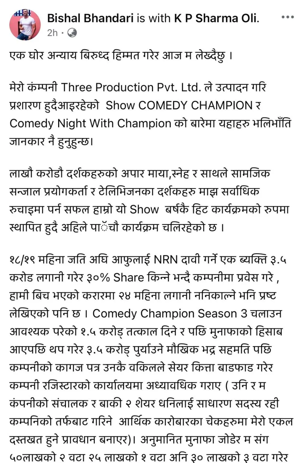भण्डारीले लेखेका छन्, ‘राज्य प्रशासनमा भएको पहुँचको दुरुपयोग गर्दै उनले मेरै विरुद्ध बैंकिङ कसुरमा मुद्दा हालेर मलाई दबाबमा राखी २ करोड ४० लाख रुपैयाँ असुले।’ भण्डारीले आफूले लगानीभन्दा बढी ९० लाख रुपैयाँ फिर्ता दिनुपरेको र सो रकमको प्रमाण आफूसँग सुरक्षित रहेको बताएका छन्। यो विवादका कारण कम्पनीको आर्थिक अवस्था संकटमा परेको र ‘कमेडी च्याम्पियन सिजन ३’ का विजेतालाई घोषित पुरस्कार गाडी दिन नसकिएको तथा केही कर्मचारीको तलबसमेत रोकिएको उनले उल्लेख गरेका छन्।