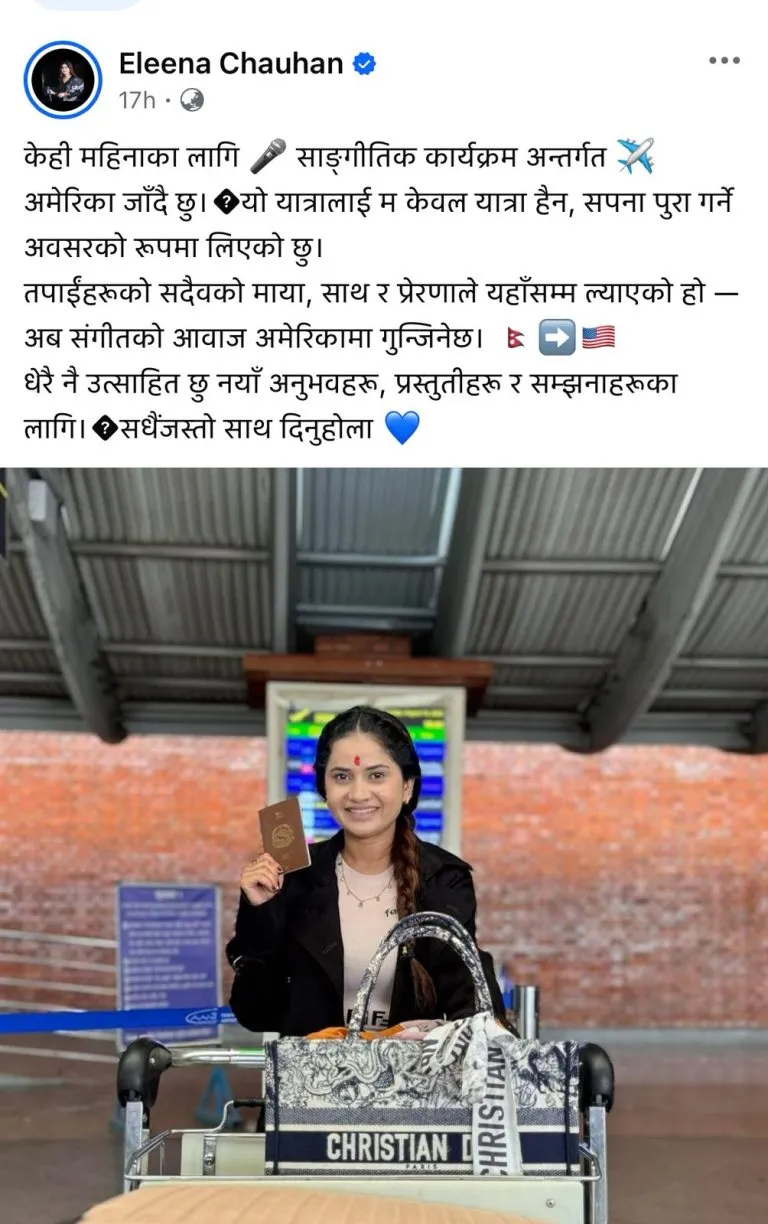 उनले थप लेखेकी छन्, ‘तपाईंहरुको सदैवको यात्रा, साथ र प्रेरणाले मलाई यहाँसम्म ल्याएको हो । अब संगीतको आवाज अमेरिकामा गुन्जनेछ।’ एलिना पहिलो पटक साङ्गीतिक कार्यक्रमका लागि अमेरिका पुगेकी छन्।