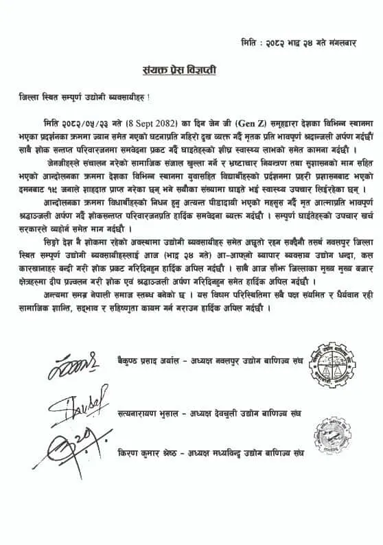 नवलपुर उद्योगा वाणिज्य संघका अध्यक्ष बैकुण्ठप्रसाद अर्याल, देवचुली उद्योग वाणिज्य संघका अध्यक्ष सत्यनारायण भुसाल र मध्यविन्दु उद्योण वाणिज्य संघका अध्यक्ष किरणकुमार श्रेष्ठले संयुक्त विज्ञप्ती निकालेर जेन जीहरुको आन्दोलनमाथि भएको दमनको विरोधमा सम्पूर्ण उद्योगधन्दा, कलकारखाना र पसलहरु एक दिनका लागि बन्द गर्न निर्देशन दिएका हुन् ।
