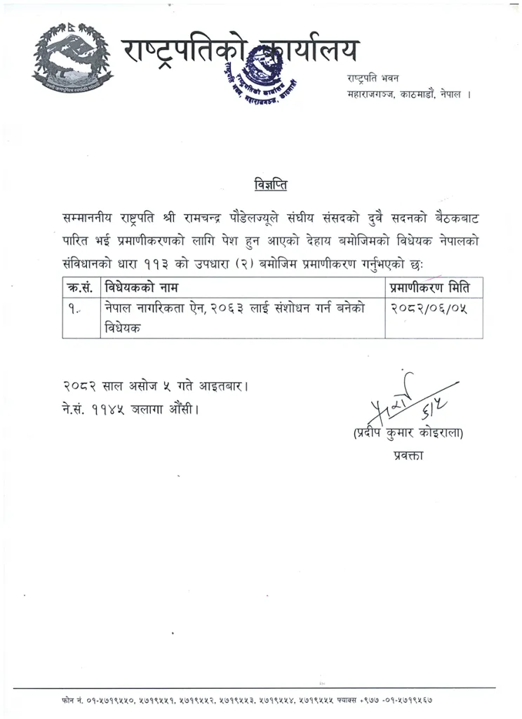 काठमाडौं । राष्ट्रपति रामचन्द्र पौडेलले नेपाल नागरिकता ऐन, २०६३ लाई संशोधन गर्न बनेको विधेयक प्रमाणीकरण गरेका छन् ।