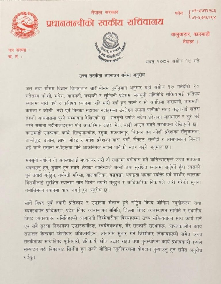 प्रधानमन्त्री कार्यालयले शुक्रबार जारी गरेको विज्ञप्तिमा कोशी, मधेश, बागमती, गण्डकी र लुम्बिनी प्रदेशमा मनसुन सक्रिय हुने भएकाले कतिपय स्थानमा भारीदेखि अति भारी वर्षा हुने अनुमान गरिएको उल्लेख छ । यसले गर्दा नदीनाला र खोलानालाको सतह आकस्मिक रूपमा बढ्ने र बाढी–पहिरो, डुबान, कटान तथा भूक्षयको सम्भावना रहेको चेतावनी दिइएको छ ।