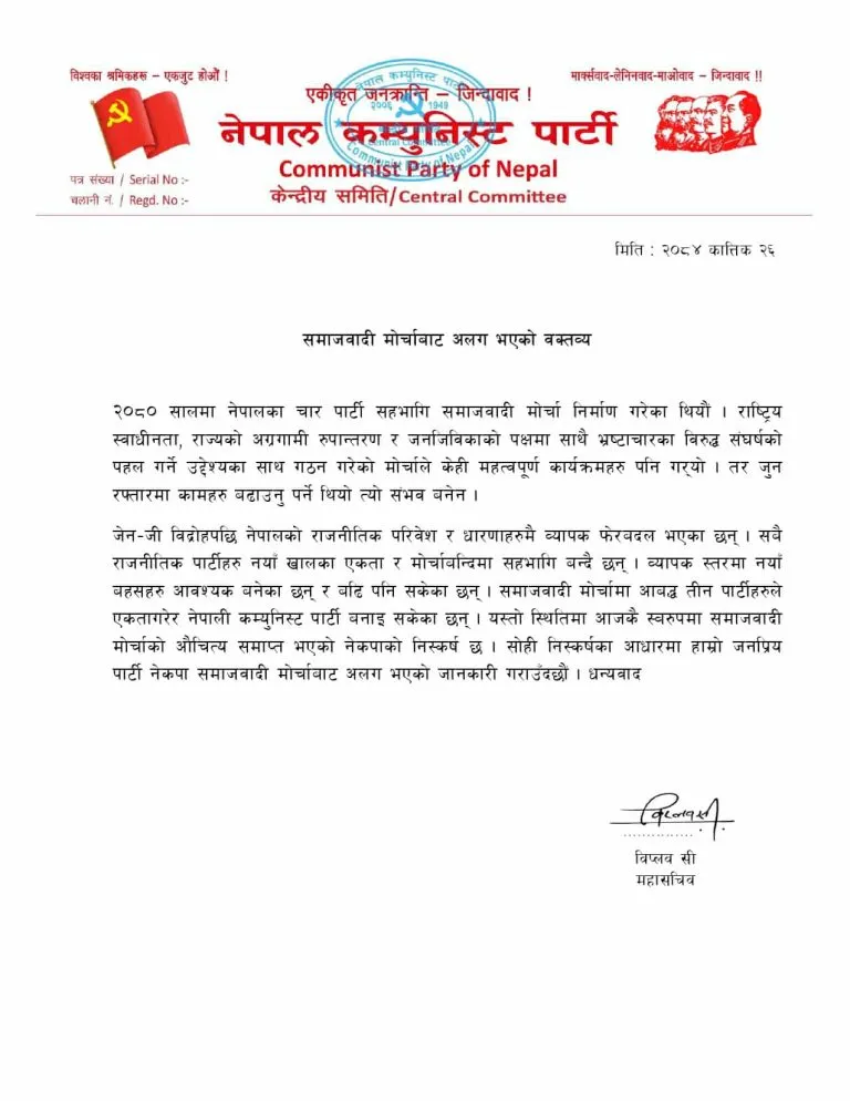 ‘२०८० सालमा नेपालका चार पार्टी सहभागी समाजवादी मोर्चा निर्माण गरेका थियौँ। राष्ट्रिय स्वाधीनता, राज्यको अग्रगामी रूपान्तरण र जनजीविकाको पक्षमा साथै भ्रष्टाचारका विरुद्ध सङ्घर्षको पहल गर्ने उद्देश्यका साथ गठन गरेको मोर्चाले केही महत्त्वपूर्ण कार्यक्रमहरू पनि गर्यो। तर जुन रफ्तारमा कामहरू बढाउनु पर्ने थियो त्यो सम्भव बनेन,’ विप्लवले जारी गरेको विज्ञप्तिमा भनिएको छ।