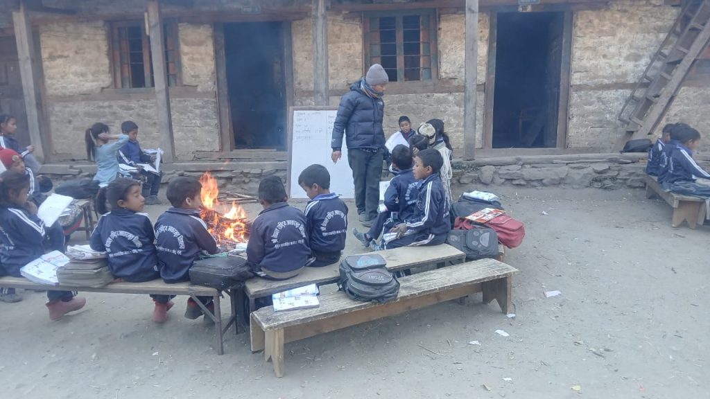 जिल्लाको पूर्वी कर्णाली भेगमा पर्ने मुगुम कार्मारोङ गाउँपालिका–९ पाँपुस्थित श्री नेपाल राष्ट्रिय आधारभूत विद्यालयमा अत्यधिक चिसोका कारण पठनपाठन प्रभावित भएको छ । हिमाली क्षेत्रमा चिसो बढ्दै गएपछि विद्यार्थीहरू कक्षाकोठामा बस्न नसकी खुला चउरमै आगो बालेर ताप्दै अध्ययन गर्न बाध्य भएका छन् । कक्षाकोठामा आगो बाल्दा दुर्घटनाको जोखिम हुने भएकाले खुला स्थानमा धुनी जगाएर त्यसकै तातोमा विद्यार्थी पढाउने गरिएको विद्यालयले जनाएको छ । भौगोलिक अवस्थाका कारण विद्यालयमा बिहान करिब ८ बजे मात्र घाम लाग्ने र दिउँसो करिब १ बजेपछि घाम पूरै अस्ताउँछ । घाम अस्ताएसँगै कडा चिसो बढ्ने गरेको विद्यालय प्रशासनले जनाएको छ । यस्तो अवस्थामा कक्षाकोठामा अध्ययन–अध्यापन कठिन भएपछि आगो बालेर कक्षा सञ्चालन गर्नुपर्ने बाध्यता सिर्जना भएको छ ।