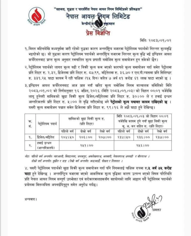 परिवर्तित मूल्य अनुसार, डिजल र मट्टीतेलको प्रतिलिटर रु २३७ पुगेको छ भने हवाई इन्धनको मूल्य प्रतिलिटर रु २५६ पुगेको छ । अन्तर्राष्ट्रिय बजारमा मूल्य वृद्धि भएको र इन्डियन आयल कर्पोरेसनले पठाएको नयाँ मूल्यसूची अनुसार हिसाब गर्दा अझै अत्यधिक घाटा रहेको निगमको दाबी छ ।