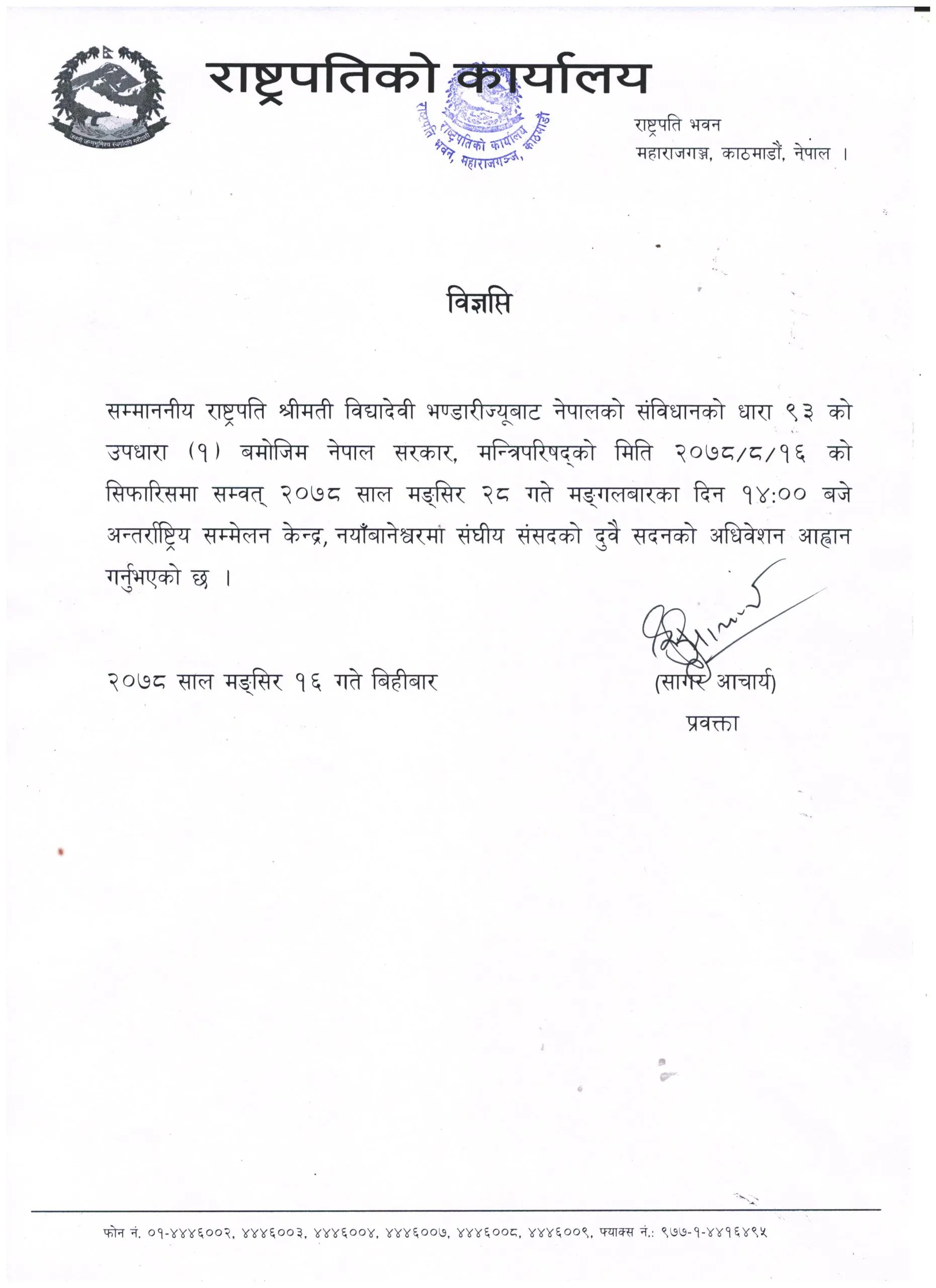 राष्ट्रपति कार्यालयले जारी गरेको विज्ञप्तिअनुसार मंसिर २८ गते मंगलबार दिउँसो २ बजेका लागि संघीय संसदका दुबै सदनको अधिवेशन आह्वान भएको हो ।