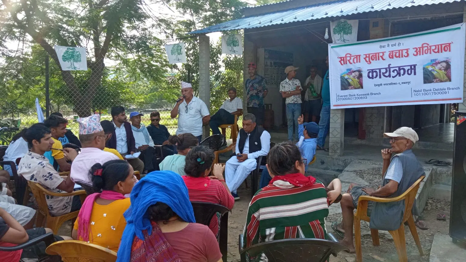 साेमबार नेपाली काँग्रेस देवचुली ९ का सभापति कृष्ण बहादुर अाले ज्यु काे अध्यक्षतामा एक कार्यक्रम काे अायाेजना गरि नवलपुर युवा मञ्चको अध्यक्ष राम सुनारकाे सक्रीयतामा सरिता सुनार बचाउ अभियान कार्यक्रम सँगै पार्टी प्रबेश कार्यक्रम पनि अायाेजना गरीएकाे थीयाे । देबचुली ९ निवासी साेम बहादुर सुनारको छाेरी बर्ष २५ कि सरिता सुनार लामाे समय देखि दुबै मृगौला फेल भई चार महिना देखि काठमाडौं टिचिङ हस्पिटल मा उपचार भईरहेकाे र उपचारकाे लागि ठुलाे रकम चाहिने र पारीवारीक अार्थिक स्थीती कमजाेर भएकाले सहयाेगकाे अपेक्षा गरि उक्त कार्यक्रम अायाेजना गरीएकाे थीयाे ।