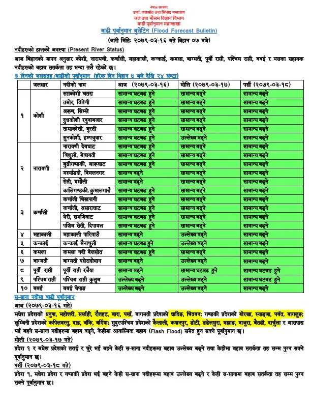 आज धनुषा, महोत्तरी, सर्लाही, रौतहट, बारा, पर्सा, धादिङ, चितवन, गोरखा, स्याङ्जा, पर्वत, बागलुङ, कपिलवस्तु, दाङ, बाँके, बर्दिया, कैलाली, कञ्चनपुर, डोटी, डडेलधुरा, बझाङ, बाजुरा, बैतडी, दार्चुला र आसपास भई बहने साना नदीहरूमा बहाव बढ्नेछ । केहीमा आकस्मिक बहाव (समेत हुन सक्ने पूर्वानुमान छ ।