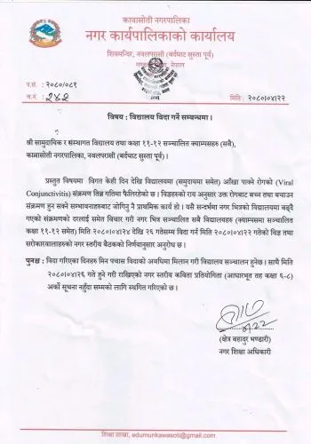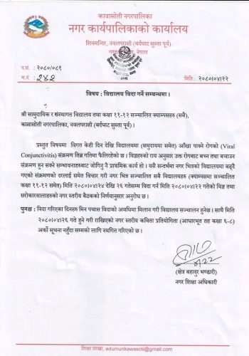 हिउँदे र वर्षे बिदाबाट मिलान गर्ने गरी बुधबार २४ गतेदेखि शुक्रबार २६ गतेसम्म सबै विद्यालय बन्द गरिएको नगर शिक्षा अधिकारी क्षेत्रबहादुर भण्डारीले जानकारी दिए । आँखा पाक्ने रोग (एडिनो भाइरस) को संक्रमण नवलपुरमा पनि बढ्दै गएको छ ।
