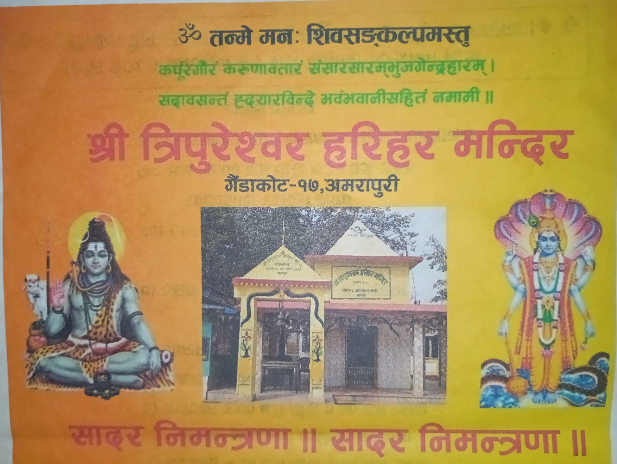 त्रिपुरेश्वर हरिहर मन्दिर गैडाकोट –१७, अमरापुरीमा श्रीमद् भागवत सप्ताह ज्ञानमहायज्ञ हुने भएको छ ।