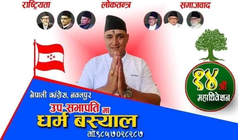 नवलपुर । नेपाली कांग्रेस नवलपुरका युवा नेता धर्मराज बस्यालले यहि पुस २७ गते हुने नेपाली कांग्रेस नवलपुरको जिल्ला अधिवेशनमा उप सभापति पदमा उम्मेदवारी दिने बताएका छ्न । नेपाल विद्यार्थी संघ बाट राजनीति जीवन सुरु गरेका बस्याल तरुण दल जिल्ला कार्यसमिति सदस्य, नेपाली कांग्रेस देवचुली-१४को वडा सभापति रहेर काम गरेका बस्या कांग्रेस नवलपुरको जिल्ला कार्यसमिति सदस्य […]